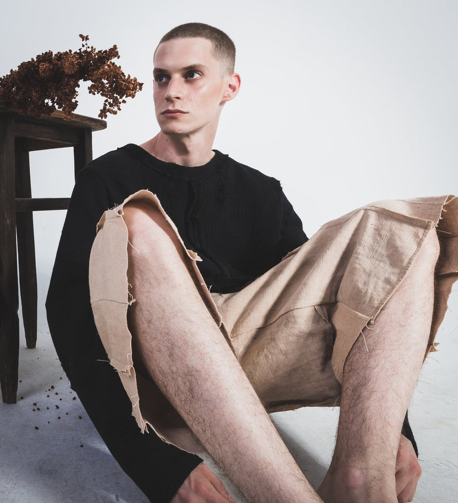 The fraying, unfinished edges of coarse-wefted shirts and tops, the randomly placed patch overlays reference the austerity of flour sacks. This solemnity is dissolved by the playful, hidden details, such as unusual placement of zippers and tie closures, through which the wearer can build a personal relationship with the garments.