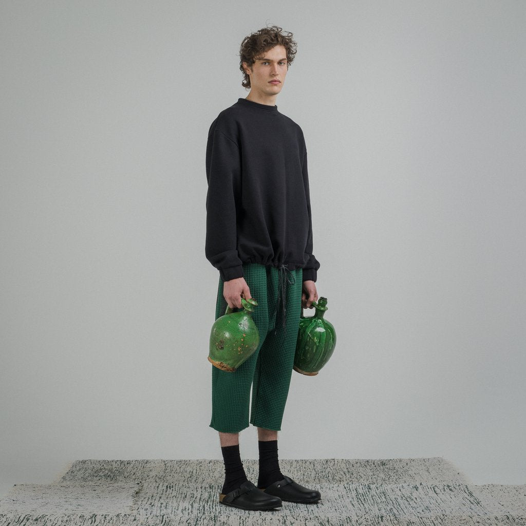 Urban designs carry fragments of the past through small, characteristic details. The strength of ox carts moving through rural landscapes manifest in unique buttons and zip pullers made of horn. Every piece is made-to-order by a small, family-owned manufactury in Italy, making every item unique to its wearer. Braided, waxed cotton cords and gesture-like strokes of paint add further handmade details to the garments. As a final touch to the collection, scarves reminisce of the kerchiefs worn by workers tied into a knot around the neck. Made with a nature-sensitive approach throughout the production cycle, the collection uses organic cotton and recycled PE fabrics.