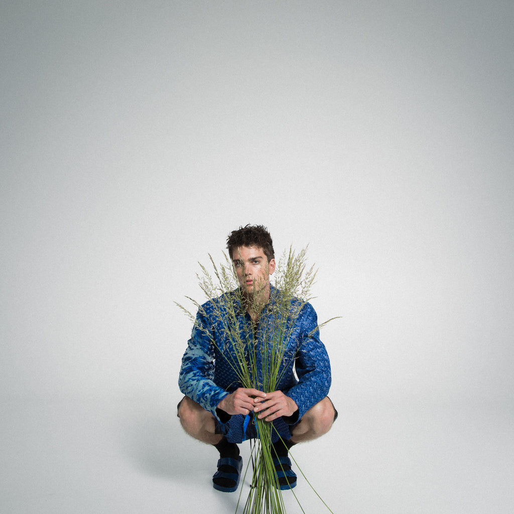 The pictures incorporated in the prints are stills from an old archive video documenting the process of blue-dying in Hungary. The result is a multimedia ode to craftsmanship: videography, graphic art, digital printing, embroidery, and garment design merge to capture an intricate technique of the past.