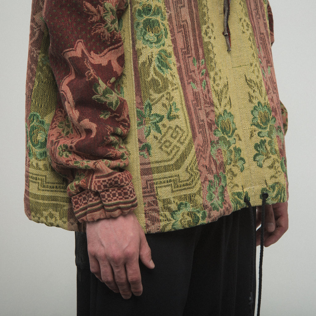 The woven textiles used in our bomber jackets, and pants and coat inserts were produced in Hungary mostly in the 1940s and 1950s. These factory-manufactured, high quality textiles were considered to be luxury items in rural Hungarian households and, as such, were used mainly as decoration and preserved in pristine condition. The textiles were utilised in their original form as they were woven: people hung them on the walls or covered tables and beds with them on special occasions to showcase wealth and taste.