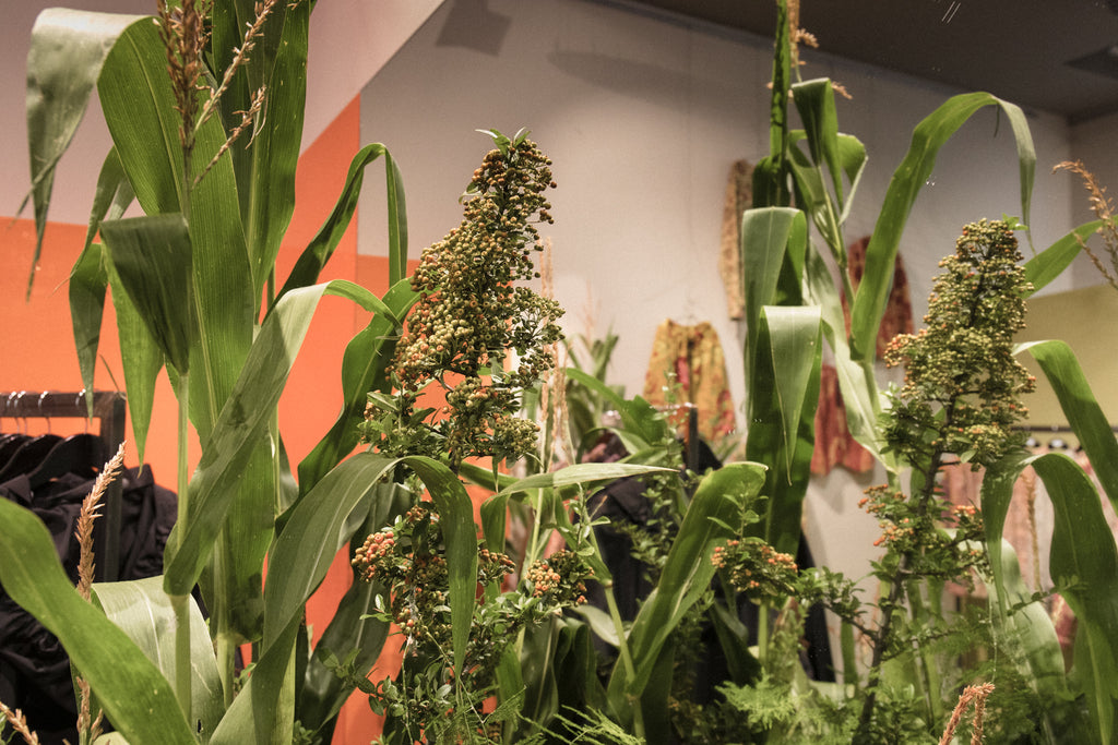 ZSIGMOND's collection titled RITUAL was inspired by the mythological world of Midsummer Night and the celebratory rituals surrounding it. Jumping over a bonfire is a ritualistic symbol of rebirth – a theme that is present throughout the collection with smudged, plant-dyed details and smouldering tones of soot and ember. The FIRE CHILD event at Defo Labor brought a piece of the countryside into the heart of the city with a life-size corn plant installation, evoking a shadow-island of nature. The event commenced with the performance of musician Soma Nové.